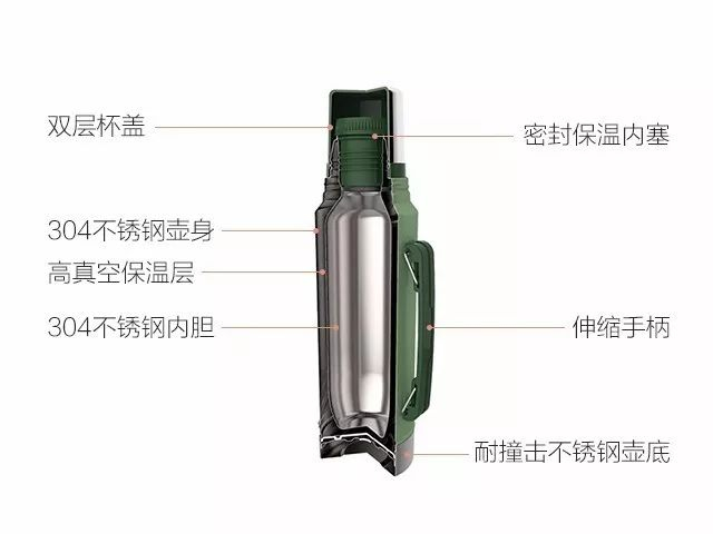 瓶身用双层不锈钢做成,双层不锈钢之间抽掉空气达到真空状态,从而实现隔热、保温的效果。