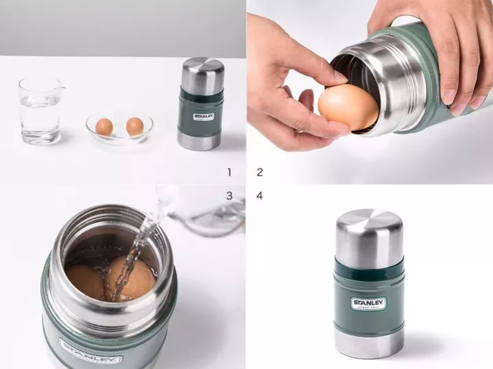 先用刚烧开的水烫一下焖烧杯(大约1分钟),然后把鸡蛋放进去(侧一点轻轻放),再加烧开的热水,盖上内盖、外盖,焖3小时,然后拿出鸡蛋。