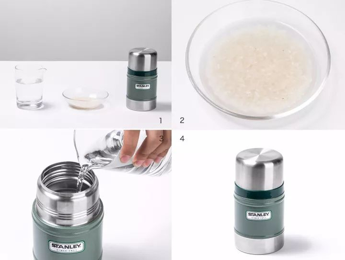 先用刚烧开的水烫一下焖烧杯(大约1分钟),然后洗好、泡好的米放进去,再加烧开的热水,盖上内盖、外盖,焖一个晚上,然后打开。