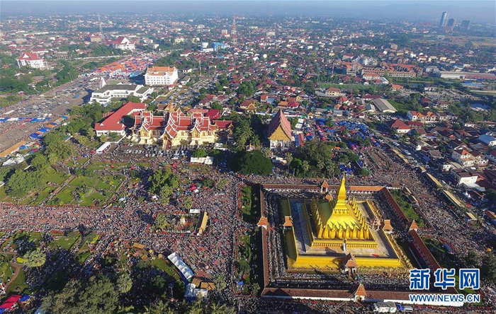 这是2016年11月14日在老挝首都万象航拍的老挝传统宗教节日——塔銮节现场。塔銮节也叫“光明节”,因在塔銮举行而得名。新华社发(刘艾伦 摄)