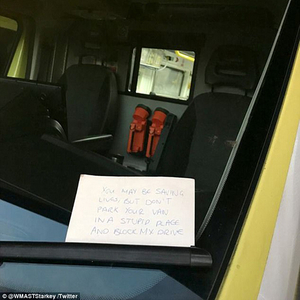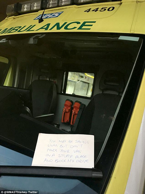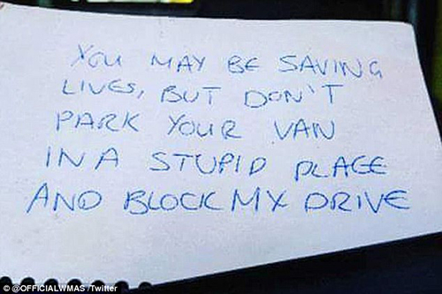 据英国《每日邮报》报道,事情发生在10号,当时这辆救护车接到求救电话称,一名42岁的病患在家中晕倒并伴有吐血的症状。当医护人员把病人抬上救护车时,发现救护车前挡风玻璃上被贴了一张字条,上面手写着:"你们可能在拯救生命,但不要把车停在这么二的地方,挡着我开车的路了"。
