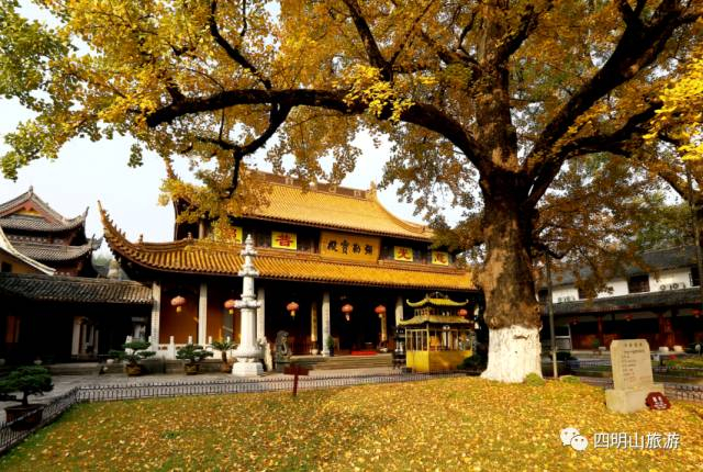 寺中的两株古银杏是雪窦寺千年岁月的见证者,左边为雌,右边为雄系汉代所栽,人称“汉代白果”。郭沫若游雪窦寺时曾说:“汉代大树,诚不虚也!”每逢秋日,银杏满叶金黄璀璨,映衬着青天和黛山,如同两盏明灯,美哉。