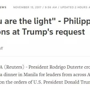 据英国《卫报》当地时间11月13日报道,菲律宾总统杜特尔特在当地时间周日(12日)在首都马尼拉举行的东盟成立50周年晚宴上,对着前来参加东亚峰会的领导人们唱起了一首菲律宾情歌《Ikaw》(“你”)。事后,杜特尔特表示,这是美国总统特朗普点的歌。