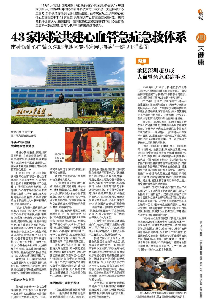 11月10-12日,国内外数十名知名专家齐聚深圳,参与2017中国深圳国际心血管论坛中国心血管外科技术与工程大会。大会探讨了心血管内、外科领域的热点问题和最新进展。在本次论坛上,深圳市孙逸仙心血管医院牵手42家医院,共建深圳市心血管急症急救体系。该院院长杨建安认为,该院目前一院两区的运营将更有利于深圳心血管急症急救体系的建设,更有利于深圳及周边患者的救治。