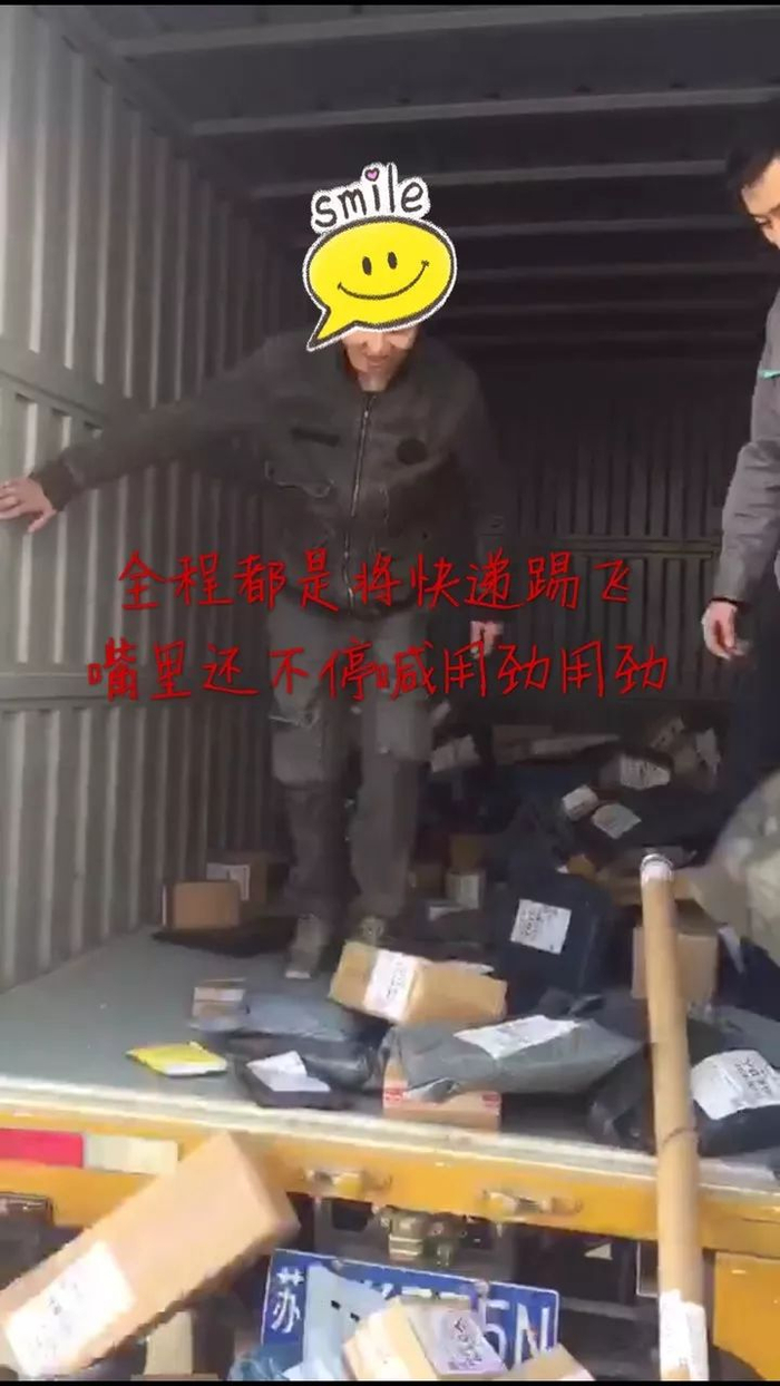 不难发现,一名男子笑嘻嘻地面对视频的拍摄者,不断地踢飞车内的多件快递,一旁还有人加油呐喊“用劲用劲”。