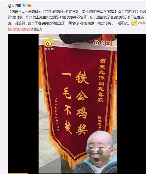 双11向来“剁手买买买”的时候,11月12日,河南郑州一男子因两年双11都不让老婆买东西,被老婆“光荣”地授予了一面锦旗。据了解,河南郑州的王先生觉得双11的优惠并不划算,所以提前收了老婆的银行卡不让她消费。没想到,第二天老婆竟然给他送了一面锦旗上面写着:铁公鸡奖,一毛不拔。男子收到锦旗后一脸尴尬与茫然。