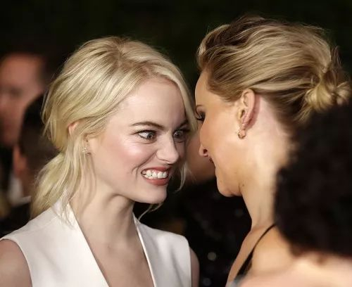 11月11日,在美国洛杉矶好莱坞,美国演员埃玛·斯通(左)与詹妮弗·劳伦斯出席第九届奥斯卡荣誉奖颁奖典礼。当天,由奥斯卡金像奖主办方美国影艺学院举办的第九届奥斯卡荣誉奖(又称“理事会奖”)颁奖典礼在洛杉矶举行。