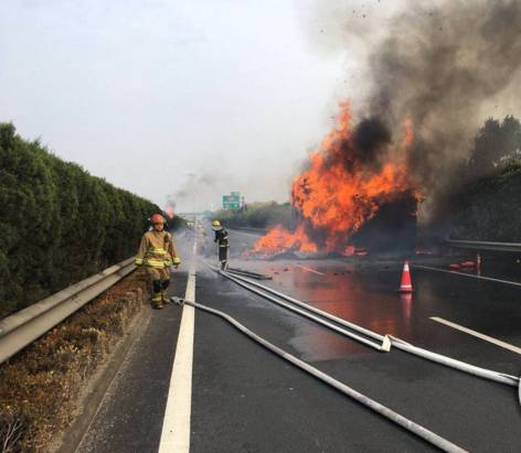 11月11日当天12点多,安徽省一家物流有限公司所辖的皖S重型半挂牵引车(快递车)在行驶到G60沪昆高速衢州段,杭州方向距常山东阁底收费站200米左右时,突然燃起熊熊烈火,驾驶员及时跳下车报警,2辆消防车经过半个小时的全力灭火,才把火扑灭,但是一车的快递付之一炬,驾驶员小武痛心地说:“具体装哪些货物我也不完全清楚,只知道大件物品如床、桌子、门板之类的家俱一共有4500件左右。”目前起火原因还在进一步调查中。