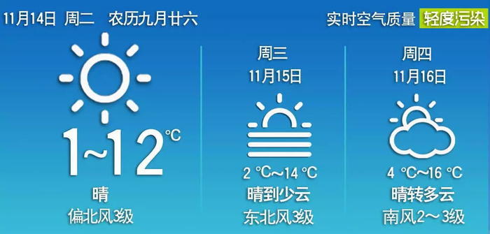 根据济南市气象台预报,13日夜间到14日白天晴,偏北风3级,14日早晨最低气温济阳、商河-2℃,市区及其他县区1℃左右有冰冻,最高气温12℃左右。14日夜间到15日晴到少云,东北风3级,最低气温济阳、商河-4℃左右,市区及其他县区-1℃~2℃,有冰冻,最高气温14℃左右。16日晴转多云,南风2~3级,气温回升。17日阴转多云,南风2~3级转北风4级阵风6~7级,气温明显下降。18日晴,北风3~4级逐渐减弱到2~3级,气温继续下降。19日~20日阴转晴,北风转南风都是2~3级,气温回升。