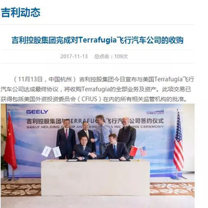 11月13日,这桩漫长的谈判终于尘埃落定。吉利控股集团宣布与美国Terrafugia飞行汽车公司达成最终协议,将收购Terrafugia的全部业务及资产。此项交易已获得包括美国外资投资委员会(CFIUS)在内的所有相关监管机构的批准。