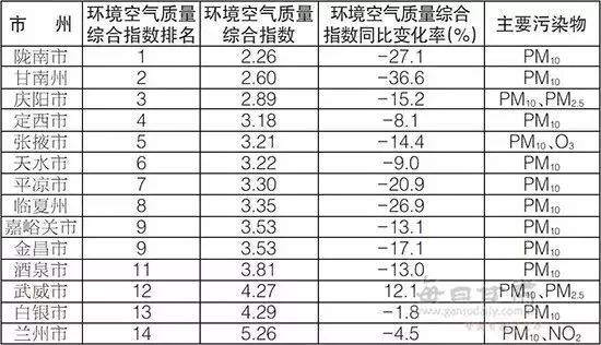 10月份,甘肃省14个城市环境空气质量综合排名由好到差分别为:陇南、甘南、庆阳、定西、张掖、天水、平凉、临夏、嘉峪关、金昌、酒泉、武威、白银、兰州。除武威外,省内其他城市环境空气质量均优于去年同期。