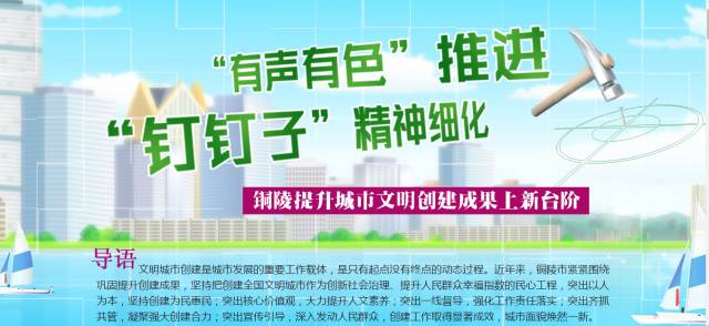 文明创建只有起点,没有终点。文明创建的过程是全民参与、共同提高的过程,是提高市民整体素质、让市民享受创建成果的过程。当下,在铜都精神鼓舞下的铜陵人民,文明创建工作正朝着这一目标大步迈进,铜陵这颗皖江明珠正以更加迷人的魅力阔步迈向全面小康的新时代。