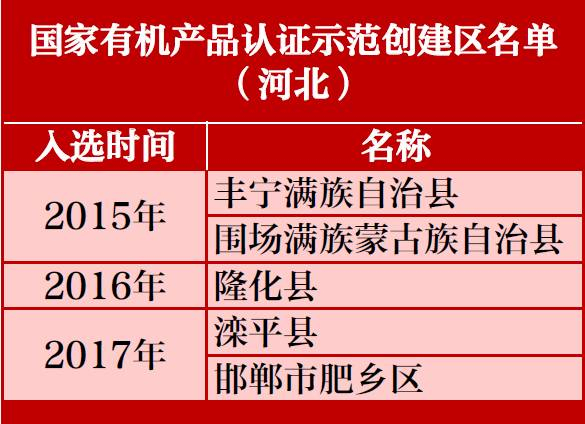近日,国家认证认可监督管理委员会公布第七批(2017年度)国家有机产品认证示范创建区名单,我省承德滦平县、邯郸肥乡区名列其中。至此,我省已有5县区获批国家有机产品认证示范创建区。(河北日报)