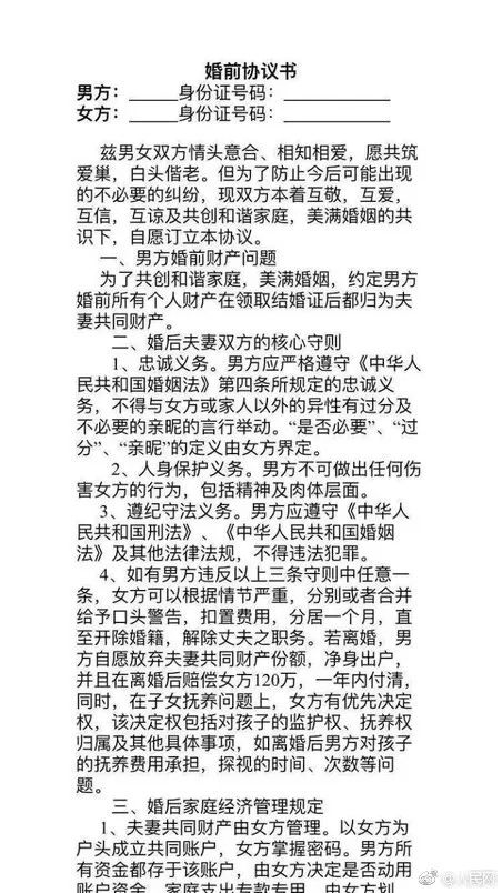 近日,网上一份新人婚前协议书,引发热议。协议里,新娘列出5大条共18小条规定和守则,条条扎心。新郎看过协议后心灰意冷,在“双11”领证当天表示:这婚不结了。原定12日的婚宴也被迫取消。据悉这份协议是新娘学法律的闺蜜帮忙拟订的。(杭州交通918)