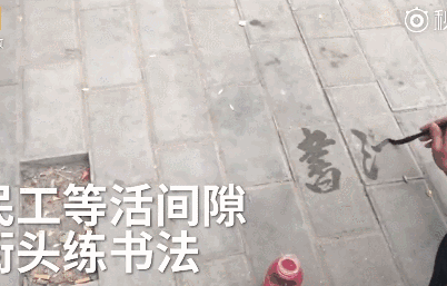 近日,河南郑州一位民工大叔在街头等活时,以水为墨,在地上练起毛笔字。他说自己是自学的,已坚持了4个月,回家后也要看书。一起干活的民工兄弟也跟着一起练:“打牌不是正事儿,这个练精气神儿!”网友:人不可貌相,佩服!(中新网)