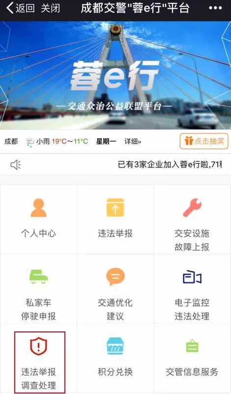 大家只要进入蓉e行平台之后,选择左下角的“违法举报调查处理”一栏。点击进入之后,处理的方式和流程与电子眼处理是一样的,非常方便。