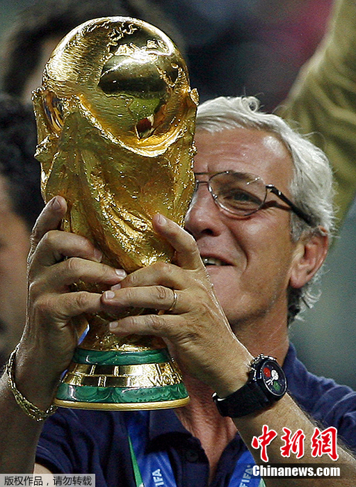 2006年7月9日,意大利在世界杯决赛中战胜法国,里皮手捧大力神杯庆祝。
