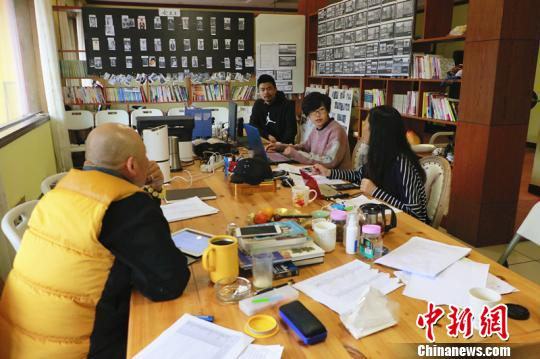 图为:电视剧《女武生》主创人员正在探讨拍摄细节。 张勇 摄