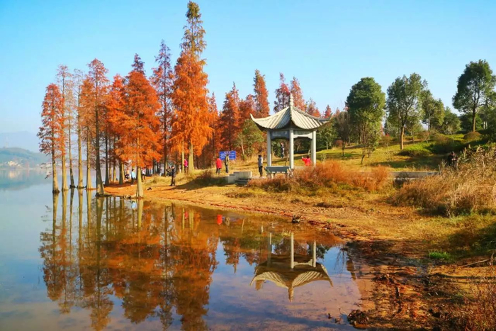 “碧水荡轻波,红叶洒山坡。”
