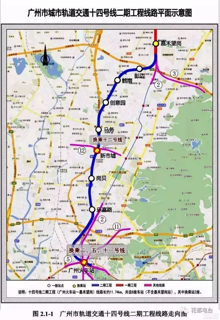 十四号线:十四号线二期工程,从广州火车站至嘉禾望岗,呈南北走向,线路长约11.74km,设8座车站(不含嘉禾望岗),换乘站2座,分别为广州火车站、新市墟站。广州火车站届时接入二、五、十一、十四号线,将成为四线换乘大站,打造成为综合交通换乘枢纽。新市墟站为十四号线与规划中的十二号线换乘。