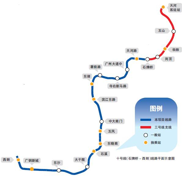 广州市城市轨道交通十号线为X形对角线中东北-西南的结构骨干线,与现三号线支线(天河客运站~石牌桥)拆解后贯通运营,连接天河客运站和西朗区域枢纽,西端与广佛线衔接。