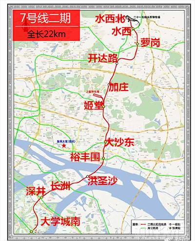 七号线二期工程线路长约22.0km,共设11座车站:深井站、长洲站、洪圣沙站、裕丰围站、大沙东站、姬堂站、加庄站、开达路站、萝岗站、水西站、水西北站。