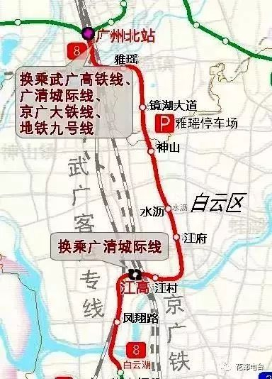 站点:白云湖—凤翔路—江高—江村—江府—水沥—神山—镜湖大道—雅瑶—广州北站换乘站2座,分别为江高站(与广清城际线换乘)和广州北站(与武广高铁线、广清城际线、京广大铁线、地铁九号线换乘)。
