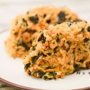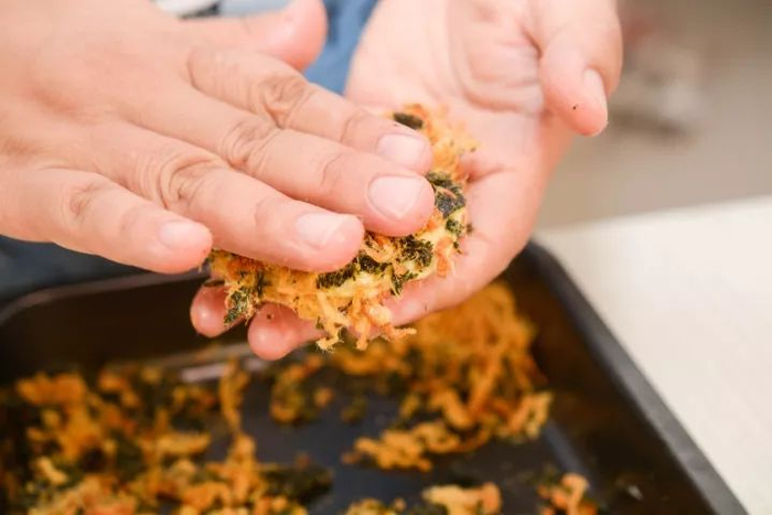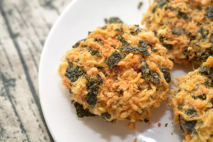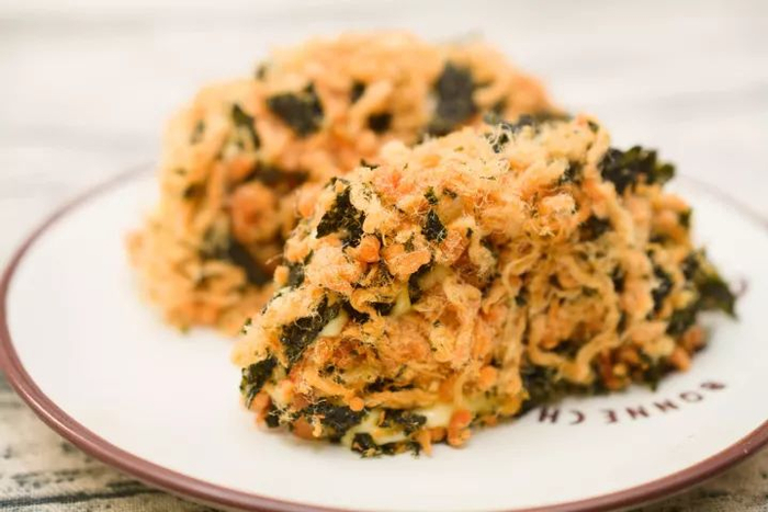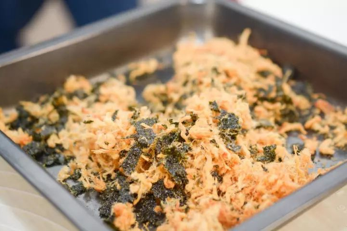 将海苔弄碎后加入到肉松一起拌均匀。肉松和海苔烘烤一下或翻炒一下会更香。