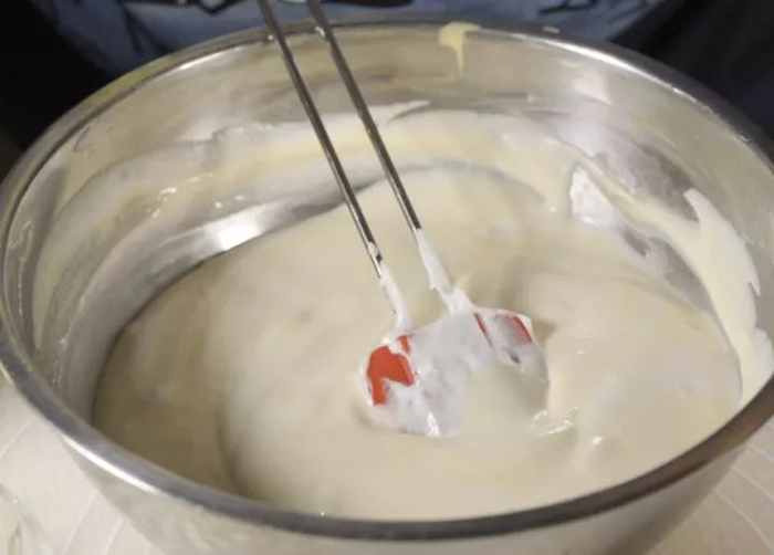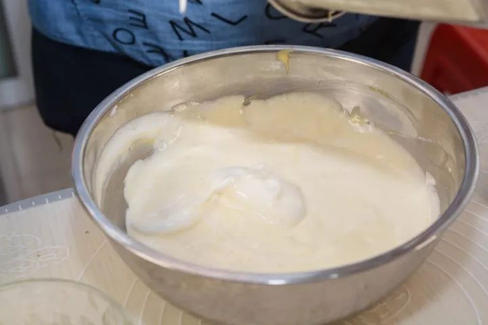 打发后的蛋清分三次加入到蛋黄糊里,上下翻拌均匀。