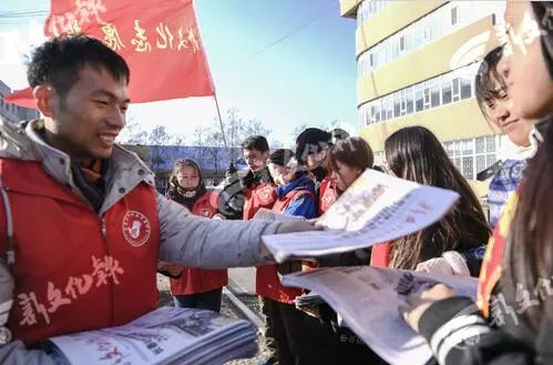 14日,长春大学团风志愿者协会的志愿者和新文化志愿者协会的志愿者们走上街头,义卖爱心报纸,再为糖糖助力。