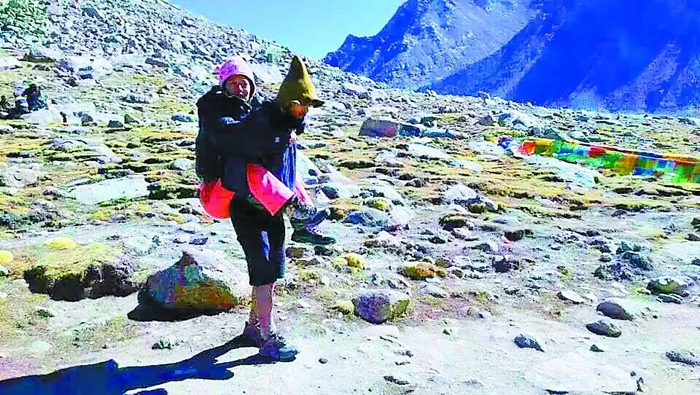 蓝天还有一项“壮举”——坐着轮椅去转山。转山用一句话概括,就是从海拔4700米的塔钦出发翻越海拔5700米的卓玛拉山口,围绕冈仁波齐一圈回到塔钦,全程约50公里。恐怕蓝天是第一个敢有转山想法的双腿残疾人吧,所幸的是她有一群愿意帮助她的朋友。他们聘请了一个当地的藏民帮忙背轮椅,而好友丁丁则背着蓝天上山下山,到了稍微平坦一些的路段,她就坚持滑轮椅。他们这支队伍,最后居然和健全人所花的行程时间差不多,两天时间就完成了转山。