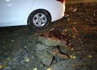 深夜,轿车在马路上正常行驶,哪知道前方突然出现"石堆",最大的石块有成年人小腿那么高。司机紧急制动,已经来不及了,轿车一头扎了进去。现场人员分析,马路上的土石方可能是大货车洒漏所致,在路面上绵延 30 余米。