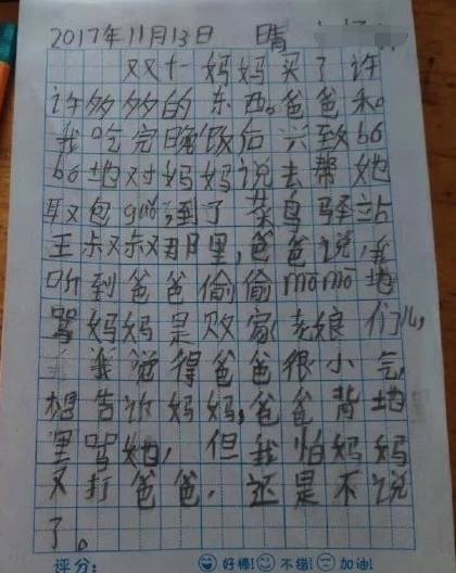 近日北京一位妈妈晒出了自己孩子的双11日记,信息量太大!在日记中,孩子说自己的妈妈又买了很多东西,爸爸非常主动地帮妈妈取包裹,看到包裹后却偷偷摸摸骂妈妈是败家老娘们儿。孩子不敢告诉妈妈,理由是”怕妈妈又打爸爸“。