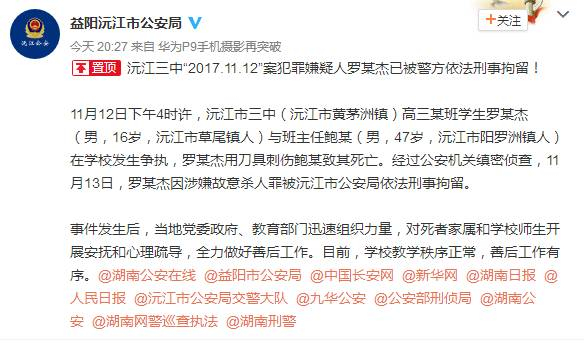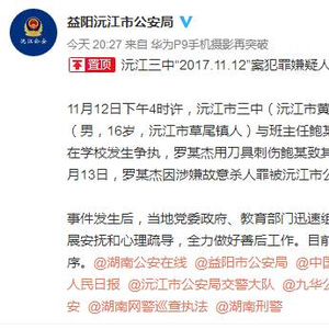 11月12日下午4时许,(湖南益阳)沅江市三中(沅江市黄茅洲镇)高三某班学生罗某杰(男,16岁,沅江市草尾镇人)与班主任鲍某(男,47岁,沅江市阳罗洲镇人)在学校发生争执,罗某杰用刀具刺伤鲍某致其死亡。经过公安机关缜密侦查,11月13日,罗某杰因涉嫌故意杀人罪被沅江市公安局依法刑事拘留。
