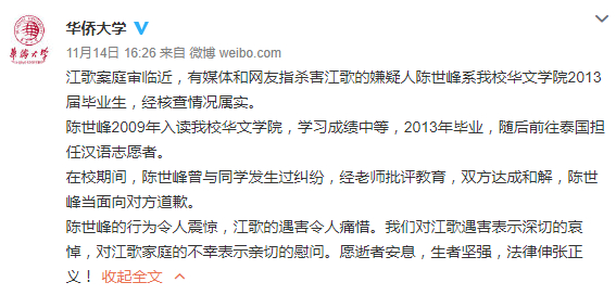 近日有网友发帖称,杀害江歌的嫌疑人陈世峰是华侨大学华文学院学生。昨天下午,华侨大学官方微博发文称,经核查情况属实,杀害江歌的嫌疑人陈世峰是华侨大学华文学院2013届毕业生。