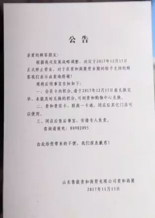 这份落款为山东鲁能贵和商贸有限公司贵和商厦的公告称:“根据我司发展战略调整,决定于2017年12月15日正式停止营业,对于在贵和商业营业期间给与支持的顾客我们表示由衷地感谢”。
