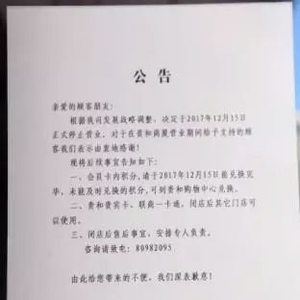 同时,公告中还提醒消费者注意部分后续事宜,如“会员卡内积分应在今年12月15日前兑换完毕,未能及时兑换的积分可到贵和购物中心兑换;贵和贵宾卡、联商一卡通在闭店后均可在其他门店使用;闭店后售后事宜安排专人负责。”