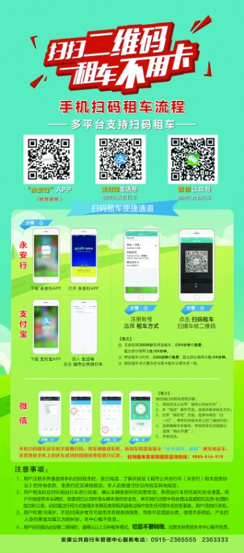 随着用微信、支付宝、永安行等3类方式外,加上原有的办理自行车租用卡方式,目前,安康市民共有4种方式可租用公共自行车。其收费标准为,1小时内免费;超过1小时,按照1元/1小时计费。
