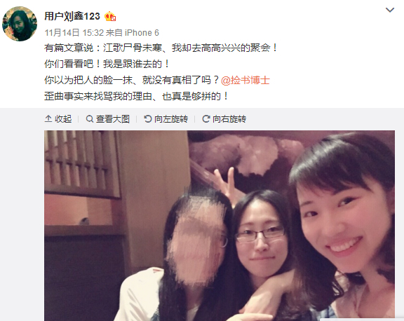 至于“和朋友出去吃饭,自拍发朋友圈”这个更是恶心的捏造。一开始网上有人贴刘鑫与两个女孩的合影,说是她在江歌遇害后的聚会照,另外两个女孩的脸上打了马赛克,看似保护无关的人。随后刘鑫也贴出了这张图,拿掉中间女孩脸上的马赛克,原来那就是江歌。也就是说,有人利用刘鑫和江歌的合照,制造了刘鑫在江歌遇害后出去聚会玩乐的谣言。如果刘鑫的所作所为是恶的,编造这种无耻谣言,其恶百倍。