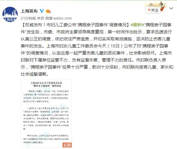 【权威发布!市妇儿工委公布“携程亲子园事件”调查情况】#最新#“携程亲子园事件”发生后,市委、市政府主要领导高度重视,第一时间作出批示,要求迅速进行认真公正的调查,依纪依法严肃追责,并切实采取有效措施,坚决防止伤害儿童事件的发生。上海市妇女儿童工作委员会今天(15日)公布了对“携程亲子园事件”的调查情况,认定这是一起严重伤害儿童的恶劣事件,社会影响极坏。上海市妇联对下属单位监管不力,负有监督失察、管理不力的责任。市妇联负责人表示,“携程亲子园事件”后果十分严重,教训十分深刻,市妇联向受害儿童、家长和社会诚挚道歉。