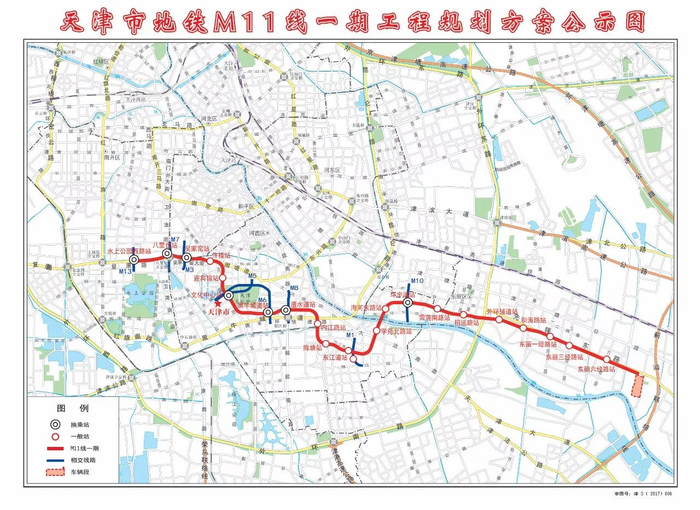 地铁11号线一期工程西起水上公园西路站,沿复康路、吴家窑大街向东敷设至友谊路,沿友谊路向南敷设至谊黄道,沿谊黄路、澧水道向东敷设至内江道,沿内江路、东江道向东南方向敷设至学苑路,线路穿越海河之后沿环宇道、先锋东路向东敷设进入东丽七经路车辆段。线路总长约23公里,均为地下敷设,共设车站21座站点,分别为水上公园西路站、八里台站、吴家窑站、佟楼站、迎宾馆站、文化中心站、黑牛城道站、澧水道站、内江路站、陈塘站、东江道站、学苑北路站、海河东路站、环宇道站、雪莲南路站、招远路站、外环辅道站、驯海路站、东丽一经路站、东丽三经路站、东丽六经路站。线路东端的东丽七经路车辆具体情况以东丽区规划分局相关公示为准。
