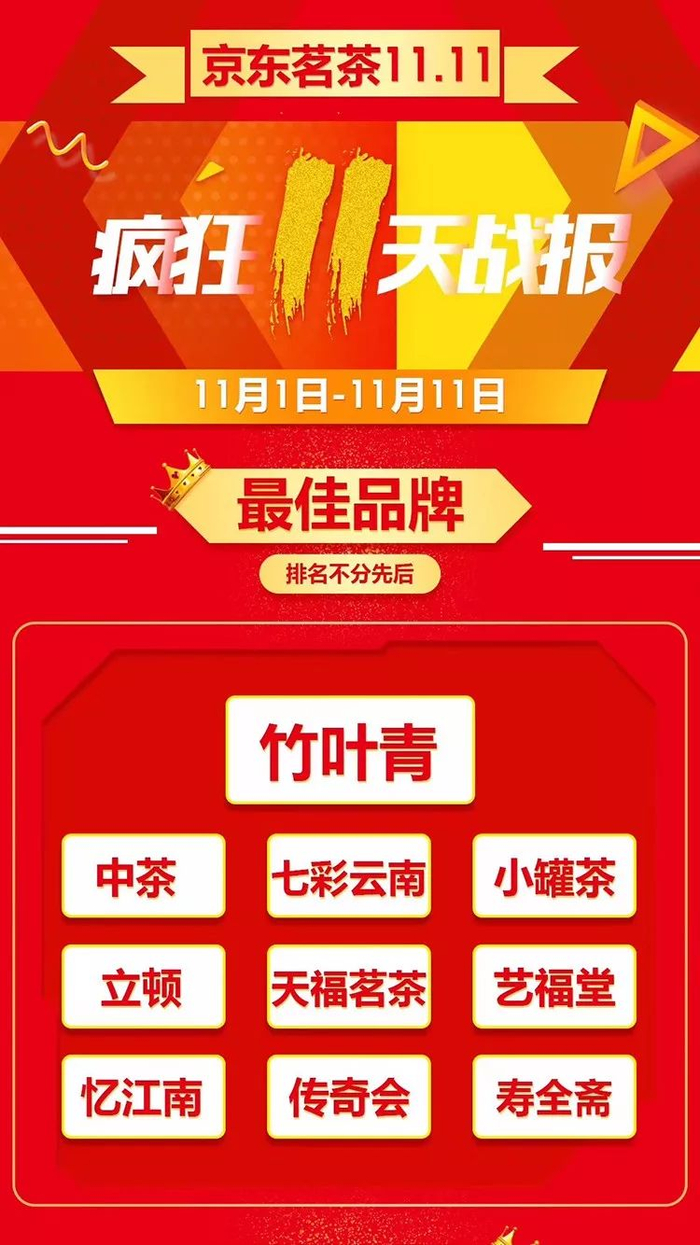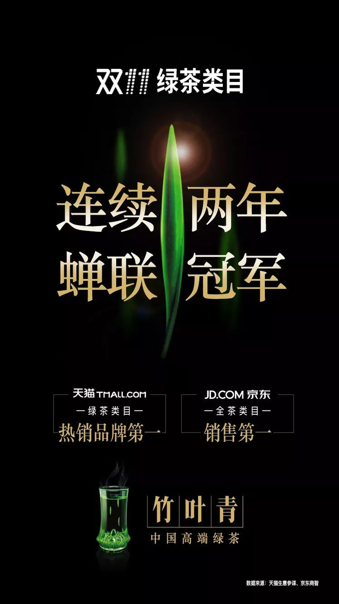 在天猫绿茶品牌销量排名前列的竹叶青,在京东同样保持着优势地位。双十一当日,竹叶青茶线上总销售额破1755万,连续两年蝉联天猫绿茶类目品牌冠军,京东全茶类目销售冠军。