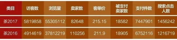 纵观全局,2017年双十一茶叶全品类访客数,较去年上升90余万,游览量上升1.7千万,客单价上涨3.25元,支付件数多出近70万,搜索点击人数提高23万。