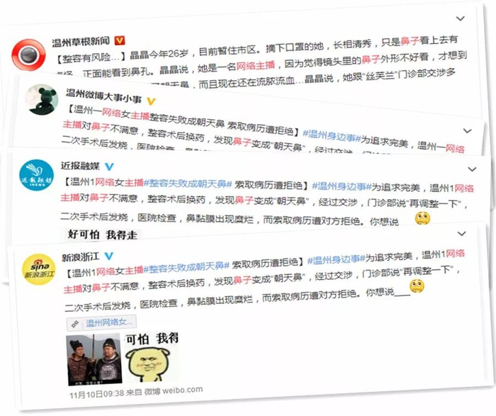 事情是这样的,几日前,温州一名网络主播晶晶在一家整容机构做了隆鼻手术,术后换药,发现鼻子变成了“朝天鼻”,经过交涉,门诊部说“再调整一下”,于是晶晶接受了二次手术。
