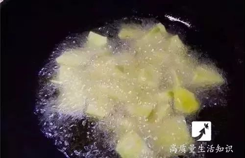 3、下入切好的块,中火炸制成熟,表面金黄。