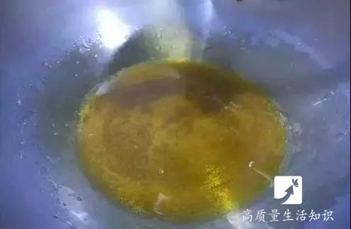 9、如图,待糖浆颜色呈黄褐色,冒起青烟,不再冒泡之时,就可以把之前炸好的块儿下锅了。