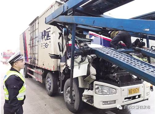 11月14日6时许,在高支直属十三大队辖区G80广昆高速横县段(六景至云表),横县往南宁方向455公里处,发生一起两货车追尾的交通事故。一辆悬挂天津号牌的重型厢式货车与前面行驶当中的重型半挂车发生追尾,事故导致重型厢式货车驾驶员受伤。据现场执勤民警刘强介绍,当天雨后路面湿滑,驾驶员操作不当,导致车辆追尾,好在伤者已被及时送院治疗。