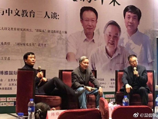 温儒敏与国际安徒生奖获得者曹文轩、北大中文系主任陈晓明坐在了主席台上,纵论语文教育、青少年写作和高考改革大势。这3位大咖也许是当今中小学语文教师和学生们最想亲近的人了。