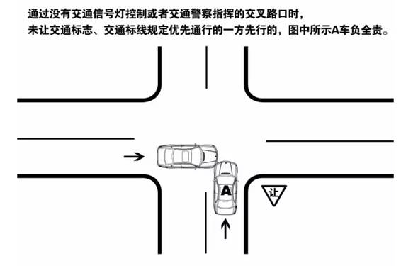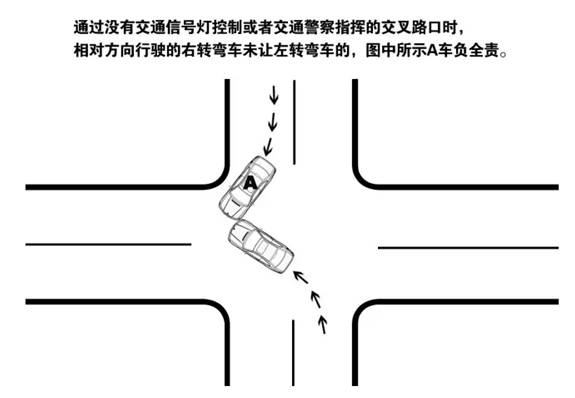 2.通过没有交通信号灯控制或者交通警察指挥的交叉路口时,相对方向行驶的右转弯车未让左转弯车的,右转弯车负全责。