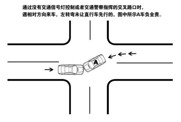 1.通过没有交通信号灯控制或者交通警察指挥的交叉路口时,遇相对方向来车,左转弯未让直行车先行的,转弯车负全责。